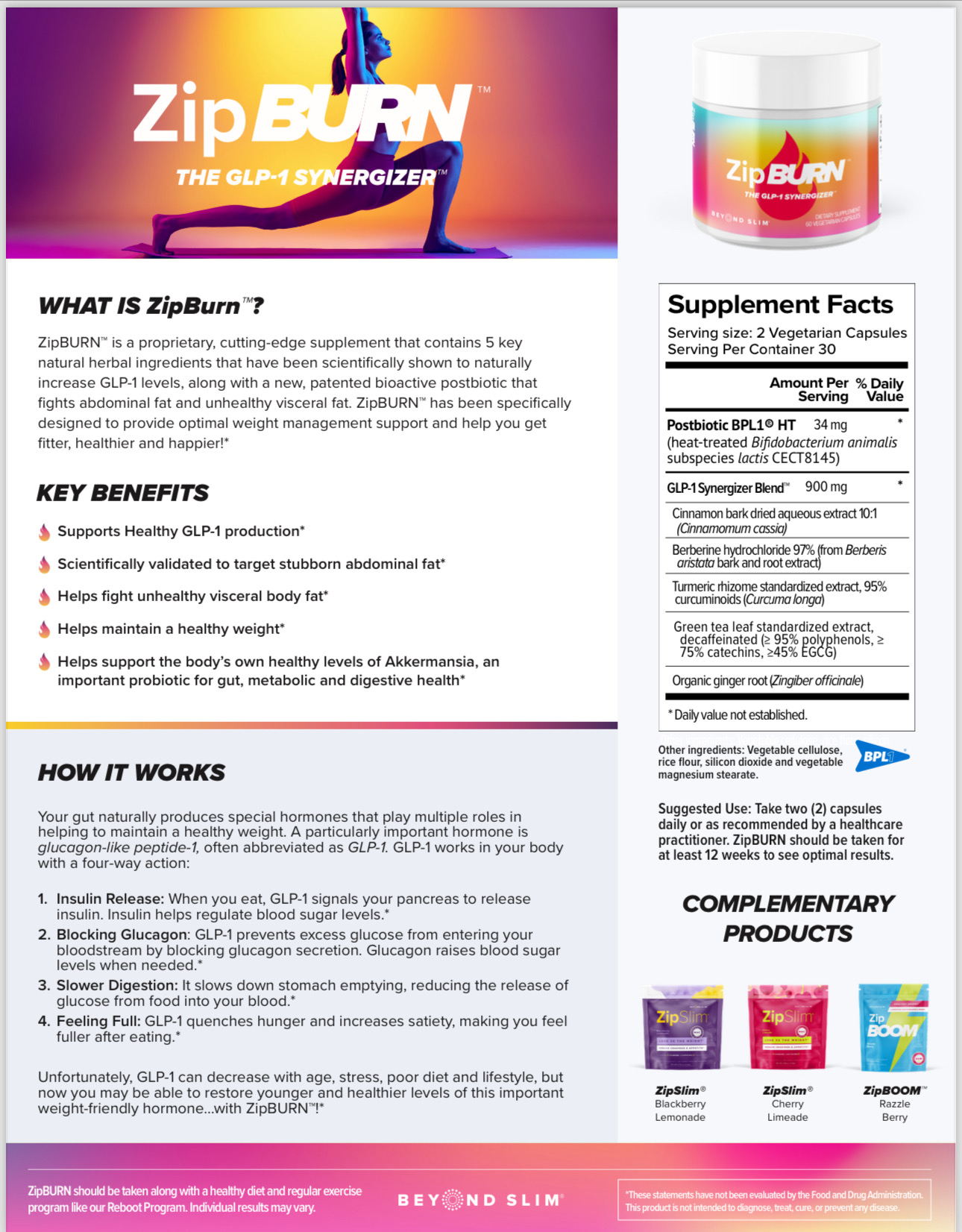 These statements have not been evaluated by the FDA. This product is not intended to diagnose, treat, cure or prevent any disease. Results may vary from person to person. When used as directed as part of your diet and exercise program. Always consult medical professional before starting a supplement.